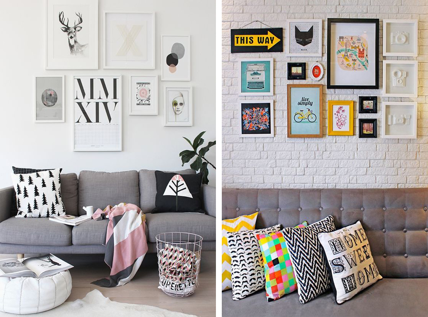 Tem uma parede e sente que falta algo nela? Aposte em quadros, posters e gravuras emolduradas. Você pode combinar vários quadrinhos menores na mesma parede – e até mesmo intercalar com fotos pessoais. As impressões não saem caras, e é possível encontrar molduras a preços bem acessíveis e atrativos em qualquer bazar.