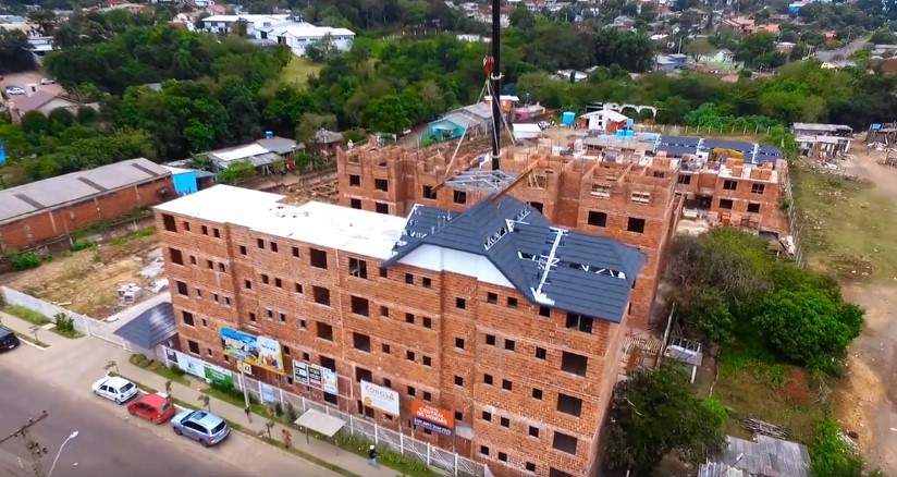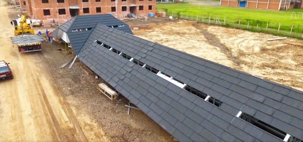 Com a expertise do nosso time, criamos um método pioneiro na construção da cobertura dos nossos empreendimentos. Nesse método, o telhado é montado a partir do chão, com estrutura em aço galvanizado leve, coberta com telhas em aço gravilhadas. Esse tipo de telha possui uma alta resistência ao ruído, além de não irradiar calor e não absorver umidade. Para selar o material e evitar sua corrosão e deterioração, é passada uma camada de acrílico transparente.